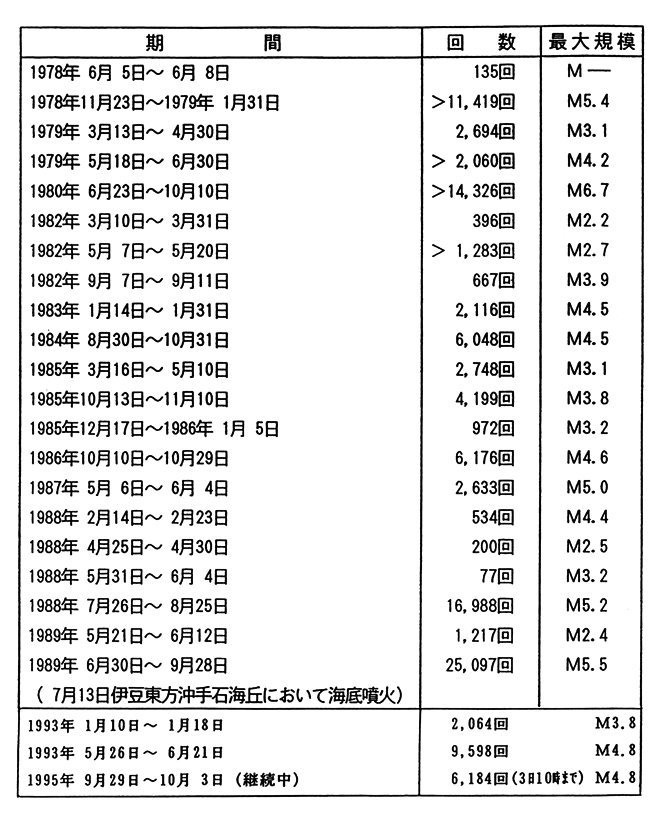 伊豆東部火山群の群発地震一覧表(1978年〜1990年、伊豆大島近海を除く)
