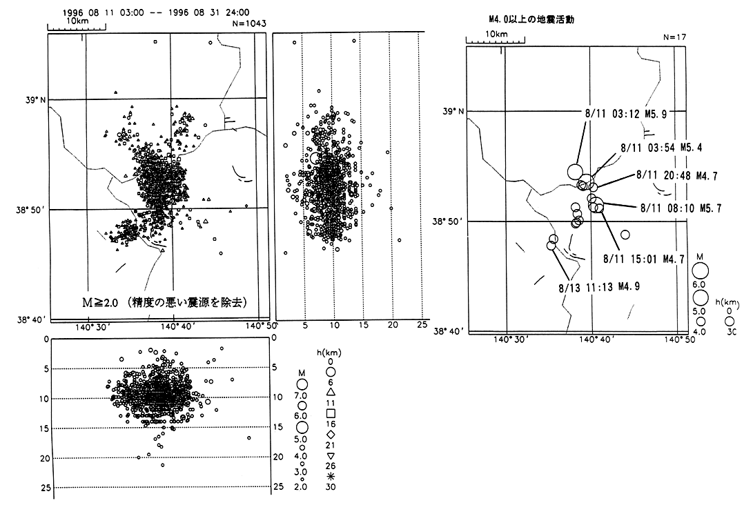 秋田・宮城県境で8/11 3:12にM5.9、3:54にM5.4、8:10にM5.7の地震が発生し、いずれも震源付近の栗駒町沼倉で震度5を観測した。その後8/11 15:01のM4.7、20:48のM4.7、8/13 11:13のM4.9などの地震が発生したが、余震活動は全体として順調に減衰した。