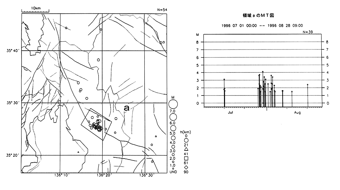 琵琶湖北東部の地震活動(1996/7/1−8/28 11:00)