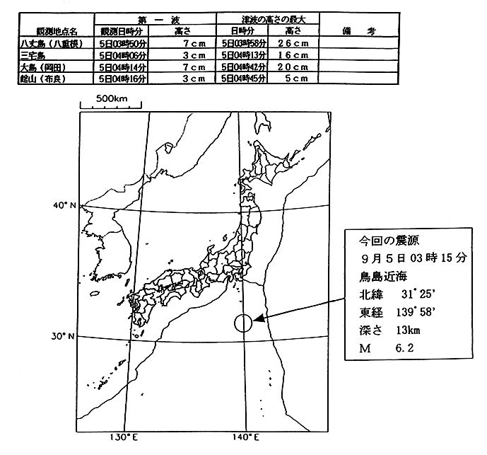 9月5日3時15分頃鳥島近海(北緯31度25分、東経139度58分、深さ13km)でマグニチュード(以下、M)6.2の地震が発生した。この地震により、気象庁は4時09分、茨城県から静岡県までの太平洋沿岸と伊豆諸島に津波注意報を発表し、5時34分に解除した。また、日本各地で津波が観測された。