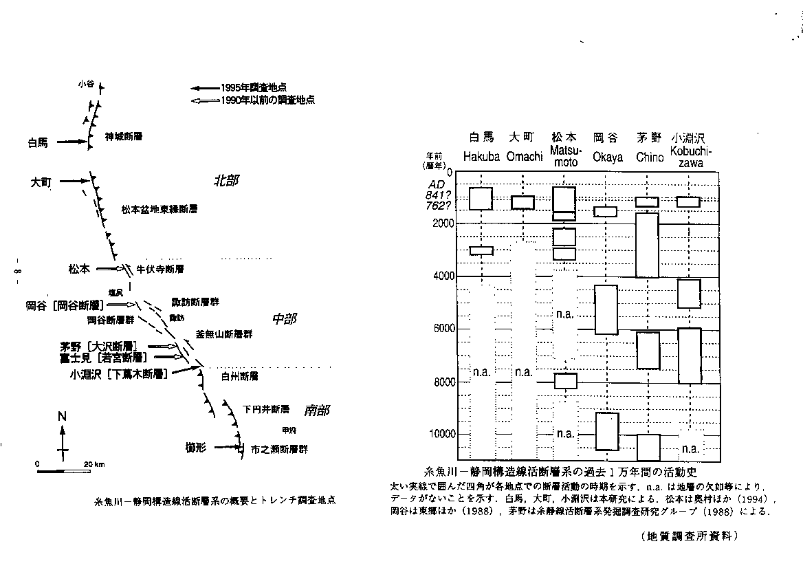 最新活動時期は調査された上記区間内の6地点のうち3地点(大町、松本、 茅野)で約1200年前に求められ、残りの地点でもそう考えて大きな矛盾はな い。また、この時期の活動に伴う変位量は6〜9mであった。この2つのことか ら、1回の地震に伴う変位量、活動区間の長さ、地震の規模の平均的な関係に基 づいて、地震の規模をM8程度と考えた。