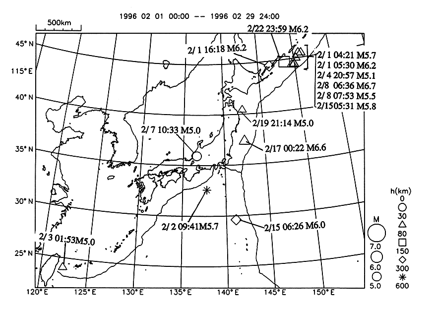 1996年2月 全国M≧5の地震活動
