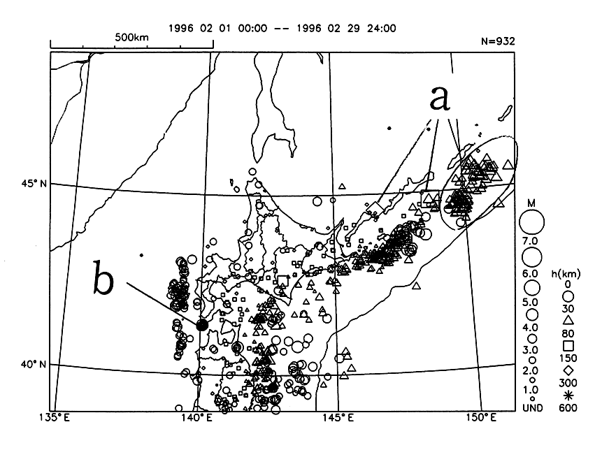 a)1995/12/4に発生した択捉島南東沖での地震(M7.2)の余震城でM6.7の地震を含む活動があった。またやや深い地震が、国後島付近(2/1 M6.2、深さ約190km)と択捉島付近(2/22 M6.2、深さ約140km)に発生した。
