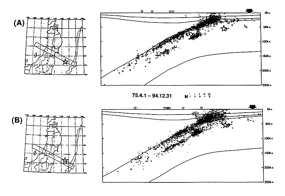 プレートの影響を考慮して再決定された地震の震源分布(海野・他1996による)。(A)、(B)それぞれの図の枠内に発生し、比較的精度良く再決定された地震の震源分布の鉛直断面図を示す。今回の地震の震源を☆印で示す。観測点と海溝軸の位置の位置を三角と矢印で示す。