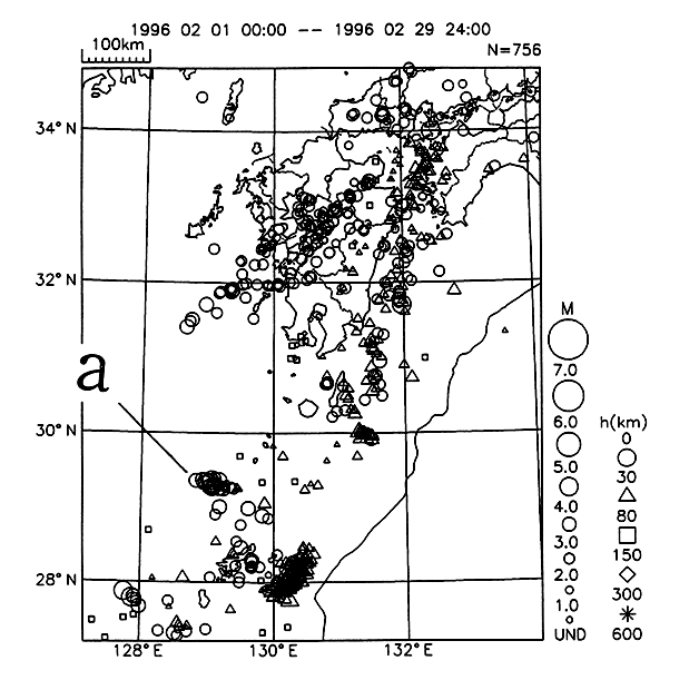 a)1995/12中旬のM5クラスの地震発生をきっかけにしてはじまった小宝島付近の活動は、翌1月には小康状態となったが2月中旬以降再び活発化した(最大は2/18と2/24M4.5)。
