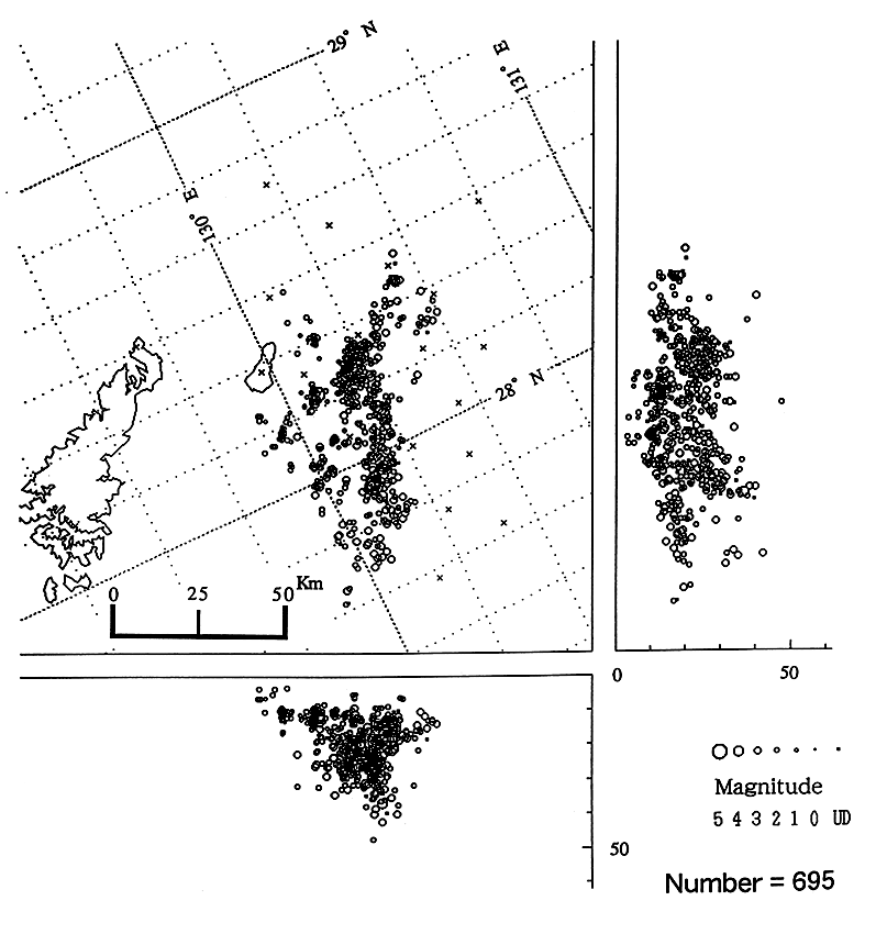 陸上観測点全点においてS/Nが良好であった地震について海底地震計を用いて求められた震源分布図。○が求められた震源、×が観測点を現わす。なお震源決定の際に用いた速度構造は、琉球弧中部で行われた構造探査(Kodaira et.al.、1996)を基に成層1次元構造を仮定した。この図から震源が幾つかの特定の領域に集中して起きていることがわかる。