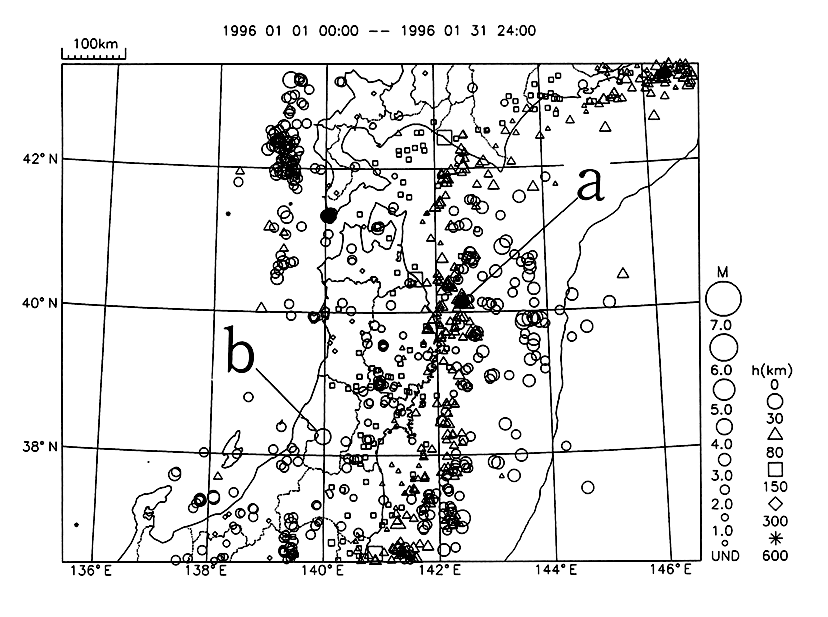 a)1/22に岩手県沖でM5.0の地震が発生した。これは1994年12月28日の三陸はるか沖地震(M7.5)の余震とみられる。