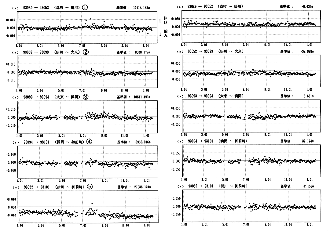 基線長変化(左図)、比高変化(右図)