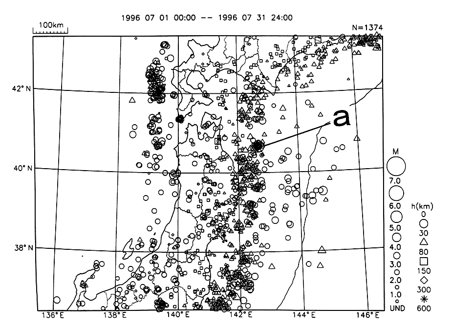 a)青森県東方沖で7/4にM5.1の地震が発生した。1994/12/28三陸はるか沖地震M7.5の余震で、震源域の北西部に位置している。