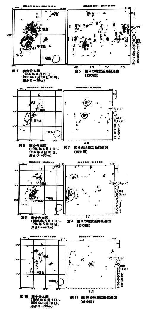 4月12日〜15日にかけて小規模な地震活動があり、約60回の地震が覿測され、そのうち有感地震が6回観測された。地震活動は、新島と神津島の中間の海域で始まり、その後、新島の北西海域に移動した(図6及び図7参照)。