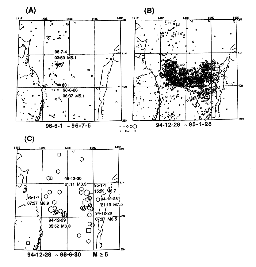 三陸沖の地震活動。(A)1996年6月1日〜1996年7月5日に発生した地震の震央分布、(B)1994年三陸はるか沖地震(M7.5)の発生から1ケ月の期間に発生した地震の震央分布,(C)1994年三陸はるか沖地鹿(M7.5)の発生から1996年6月30日の期間に発生したM≧6の地震の震央分布。