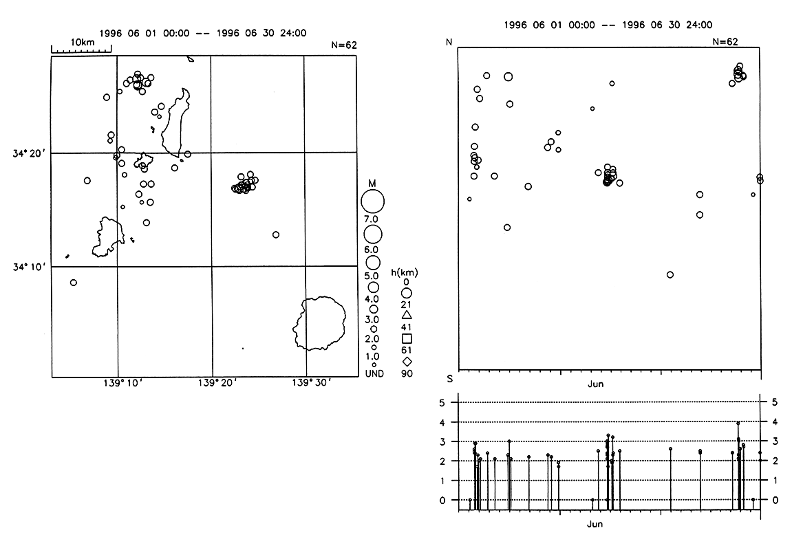 6/15−16に新島の南東海域でM3.3を最大とする活動、6/28−29に新島北西海域でM3.9を最大とする活動があった。