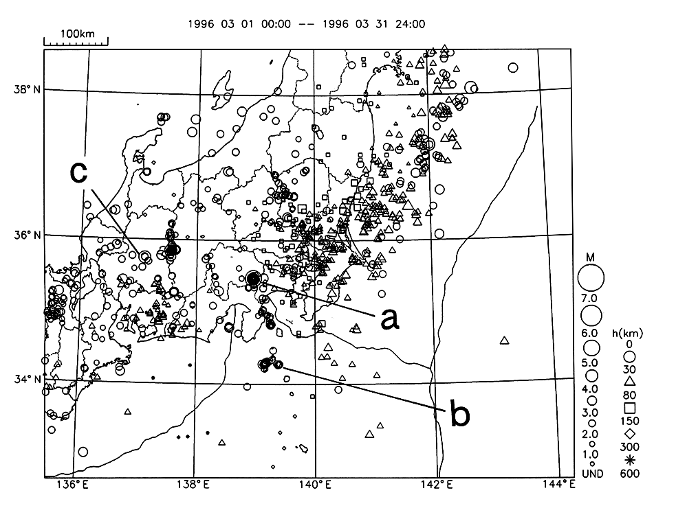 a)山梨県東部で3/6にM5.8の地震が発生した。余震活動は、3月半ば以降はM2−3クラスの地震が散発する程度である。最大の余震は3/18のM3.6であった。