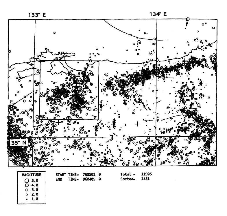 鳥取観測所で決定された地震分布(1976年5月1日〜1996年4月4日)