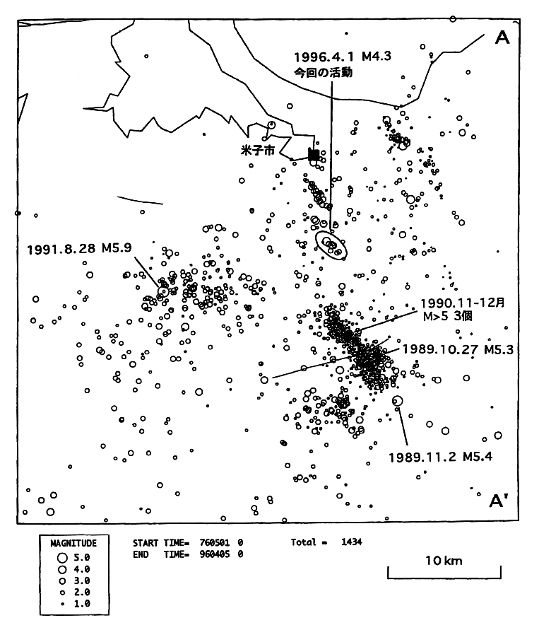 鳥取観測所で決定された地震分布(1976年5月1日〜1996年4月4日)