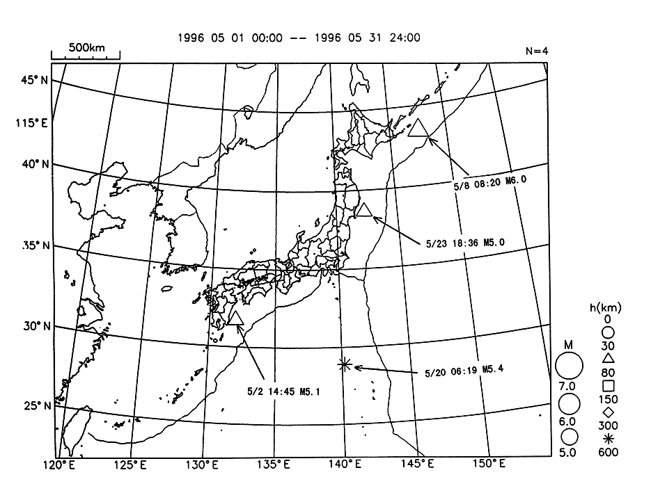 M≧5.0の地震が、北海道東方沖、宮城沖、鳥島近海、日向灘で発生した。