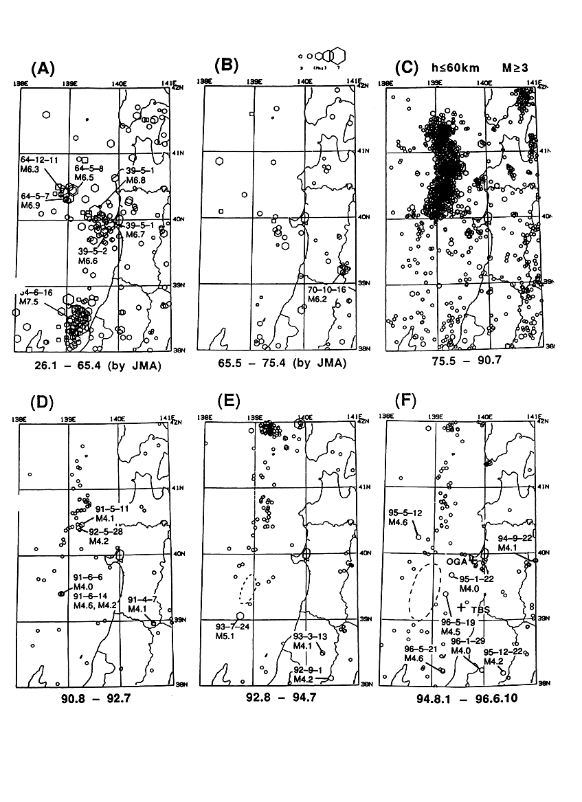 東北地方の日本海下におけるM≧3の地震の震央分布の時間変化。(A)1926年1月〜1965年4月(気象庁による)。(B)1965年5月〜1975年4月(気象庁による)。(C)1975年5月〜1990年7月。(D)1990年8月〜1992年7月。(E)1992年8月〜1994年7月。(F)1994年8月〜1996年6月10日(1996年5月以降のデータは暫定値)。地震活動が現在静穏化している可能性のある領域を破線で示す。
