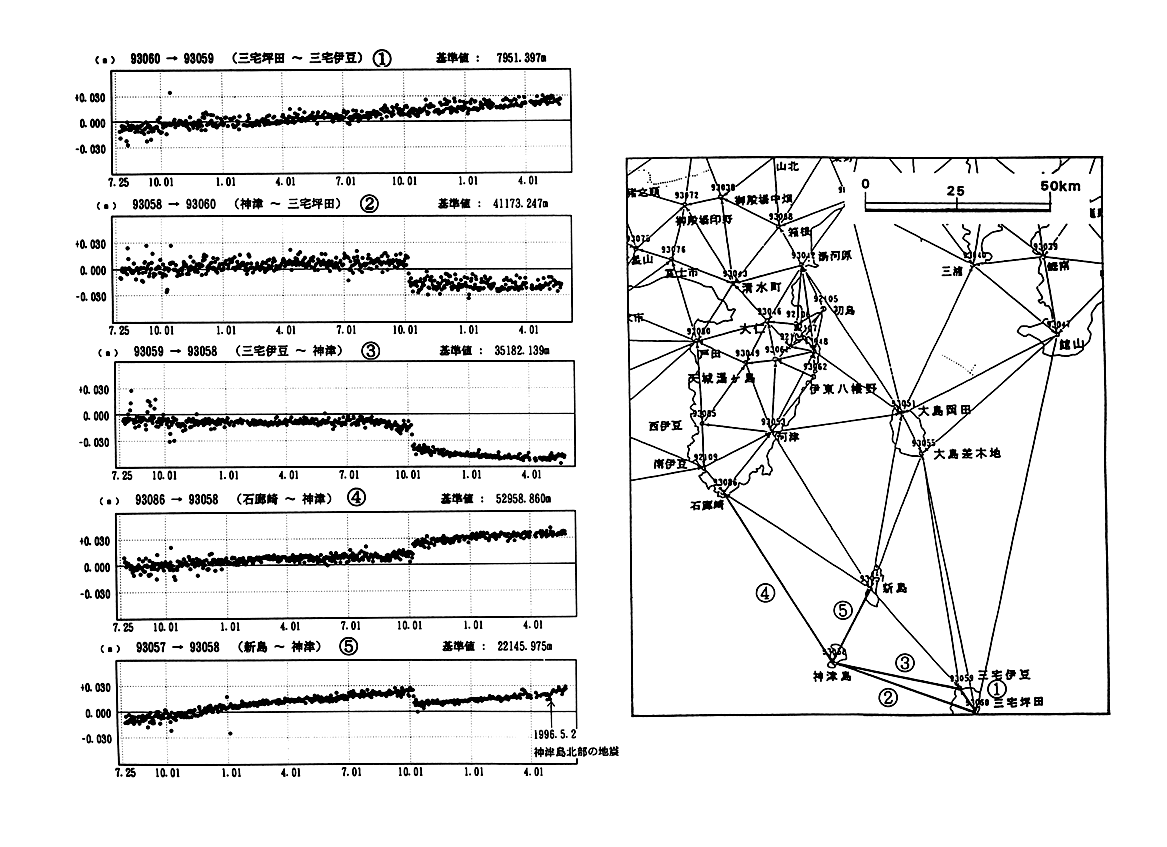 新島〜神津島の基線長には5月2日神津島北部の地震時にわずかな変化が見られるが、データのばらつきもあり決定的なことはいえない。