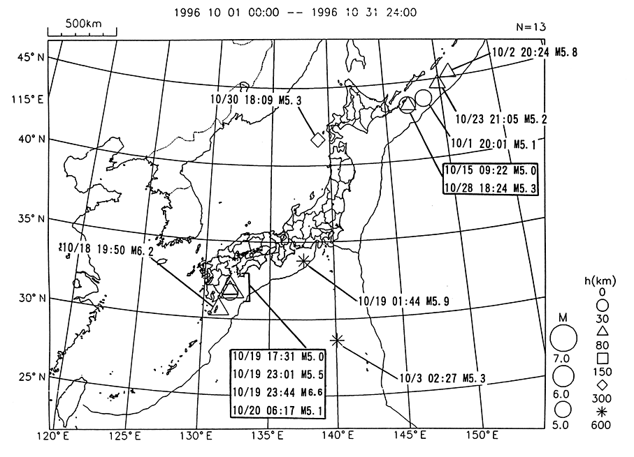 全国M(マグニチュード)5以上の地震 (1996/10/1−1996/10/31)
