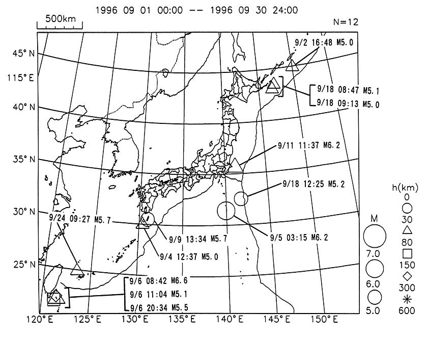 M≧6の地震が千葉県東方沖、鳥島近海、台湾付近で発生したほか、M≧5の地震が択捉島付近、北海道東方沖、八丈島東方沖、種子島近海、石垣島近海、台湾付近に発生するなど海域での活動が目立った。