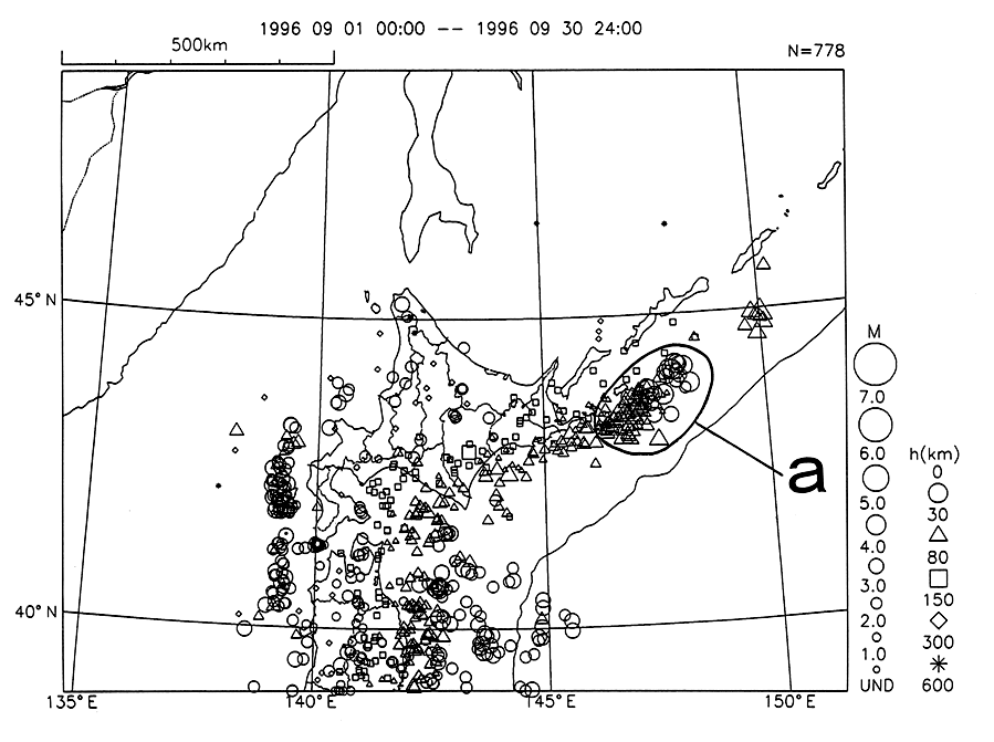 a)北海道東方沖地震(1994/10/4 M8.1)の余震域で9/18にM5.1とM5.0の地震が発生した。