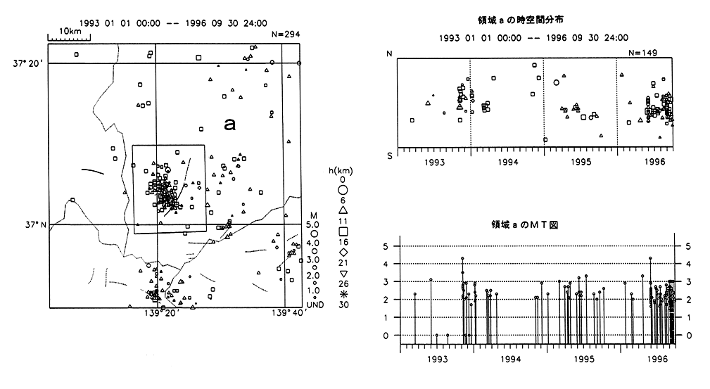 福島県南西部(檜枝峡付近)の地震活動(1993/1/1−1996/9/30)