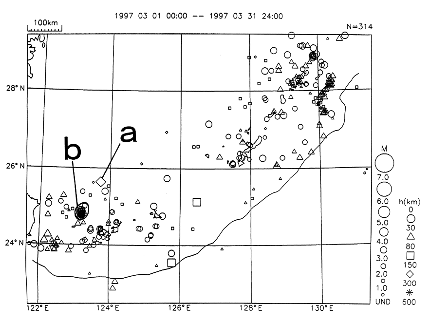 b)石垣島近海で集中的な活動があった(最大は3/26にM4.2)。