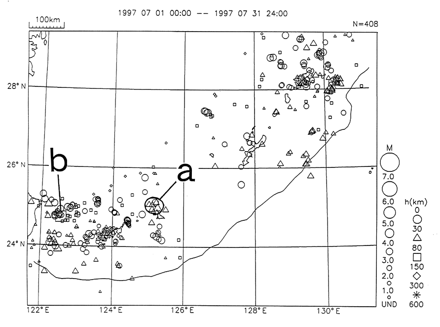 a)宮古島近海で7/24にM4.3の地震が発生した。ほぼ同じ場所で6/19にM4.7の地震が発生している。