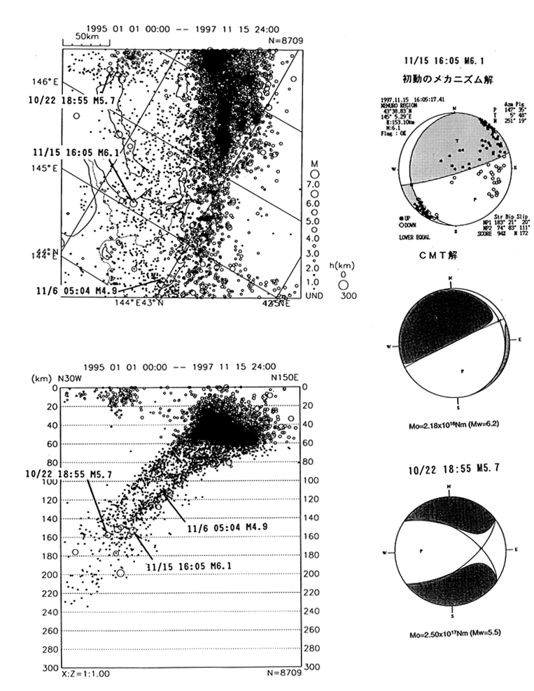 11/6 M4.9、11/15 M6.lの地震は、2重地震面の下面付近で起こった太平洋プレート内の地震である。