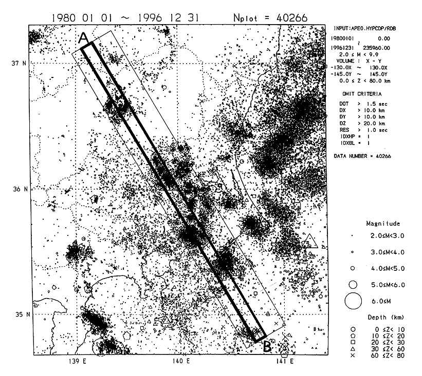 南関東地域において最近17年間に発生したマグニチュード2以上の地震の震央分布図(深さ<80km)。