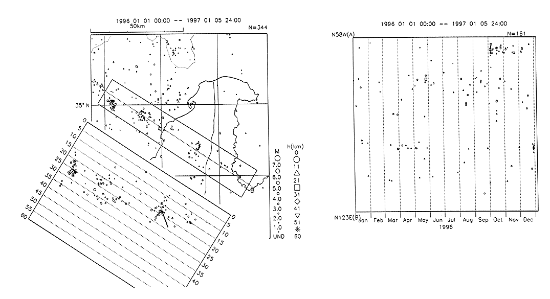 石花海堆付近の地震活動(1996/1/1−1997/1/5)