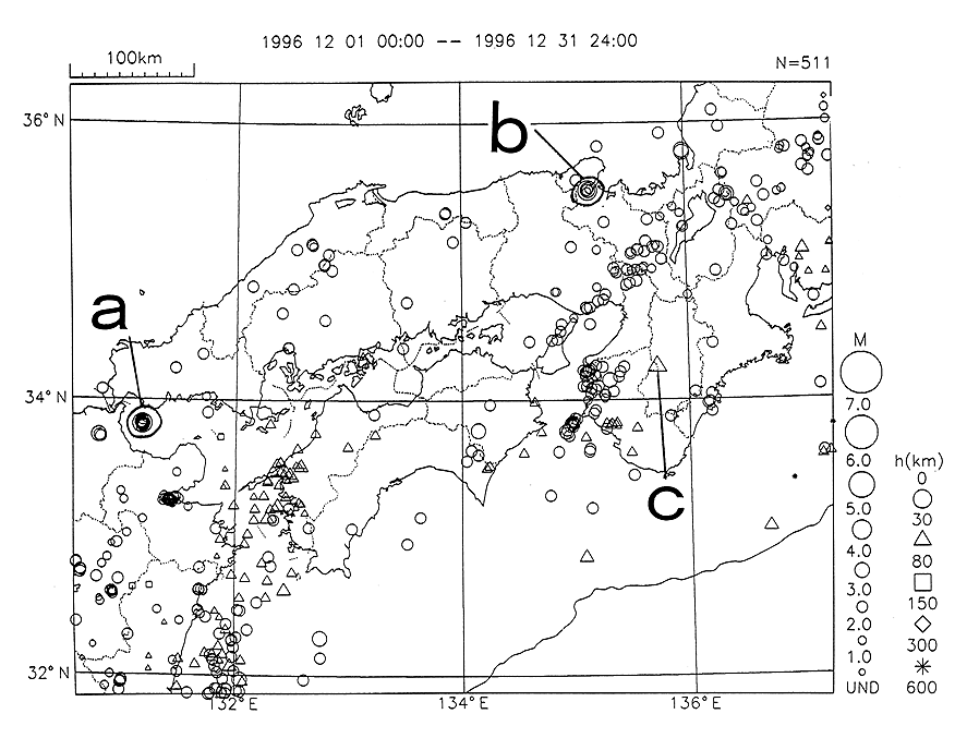 a)周防灘では12/16にM4.1、4.0の地震が発生したが、それ以降M2.5〜3.9の地震が続いている。