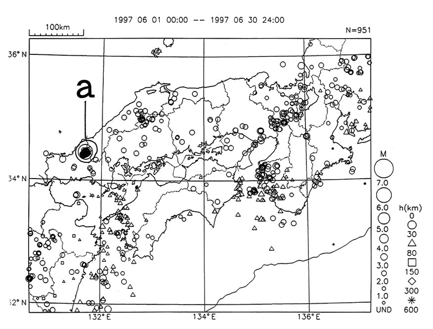 a)6/25に山口・島根県境付近で、M6.1深さ12kmの地震が発生した。なお、この地震の震源域に21日にM1.8の地震があった。