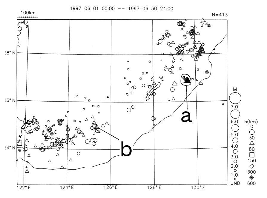 a)6/2M5.1、6/3M5.4の地震が沖縄本島近海に発生した。6/7にはほぼ活動は収まったが、M3クラスの地震は、その後も数個発生している。