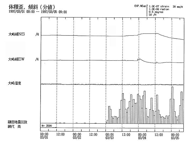 伊豆半島東方沖の地震活動 体積歪計、傾斜(分値)