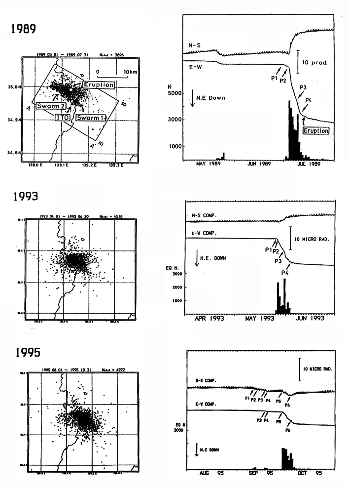 伊東観測点における傾斜記録と鎌田における地震回数