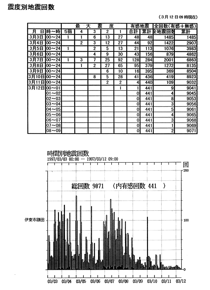 3月5日10時からは、有感地震回数に伊東市川奈に設置した震度計の震度データも含まれている。