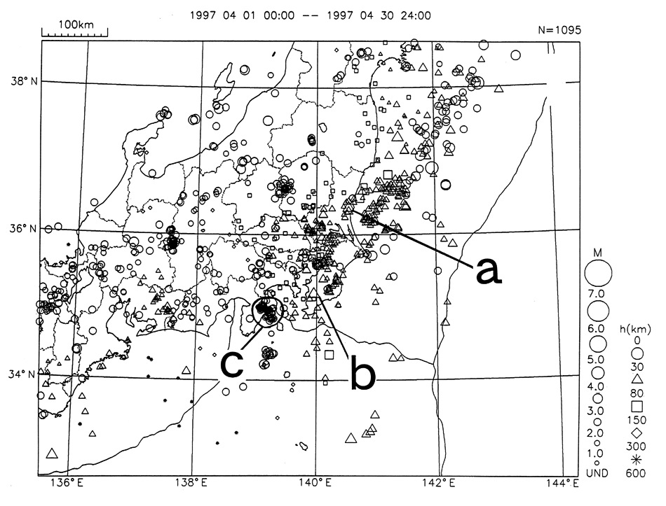 b)千葉県南部で4/10にM4.0(深さ79km)の地震が発生した。
