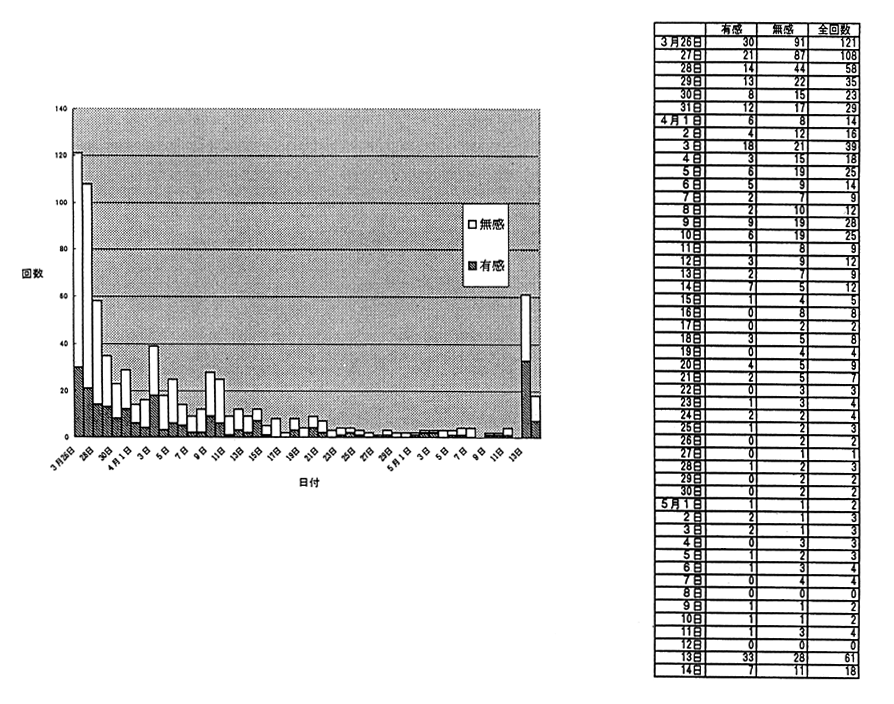 鹿児島県北西部(薩摩地方北部)の地震活動 鹿児島県薩摩地方の地震の余震回数の推移