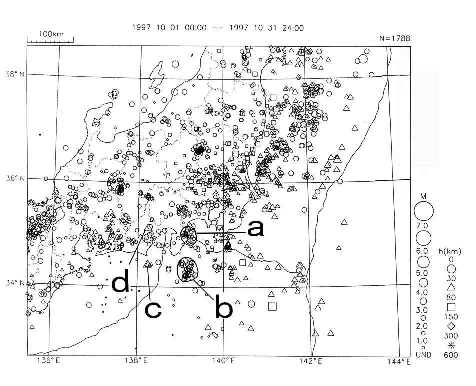 c)御前崎沖の深さ36kmで10/11にM4.9の地震が発生した。その後M2−3程度の地震が4個観測されている。ほほ同じところで9/26にM4.0の地震が発生している。
