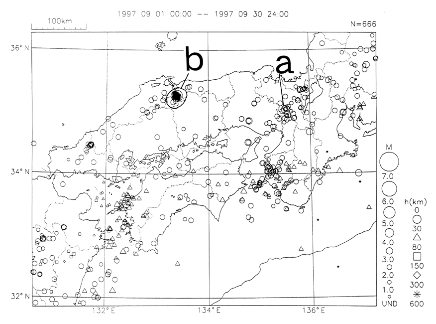 b)鳥取県西部で9/4にM5.2の地震が発生した[最大震度4]。余震活動は順調に減衰している。