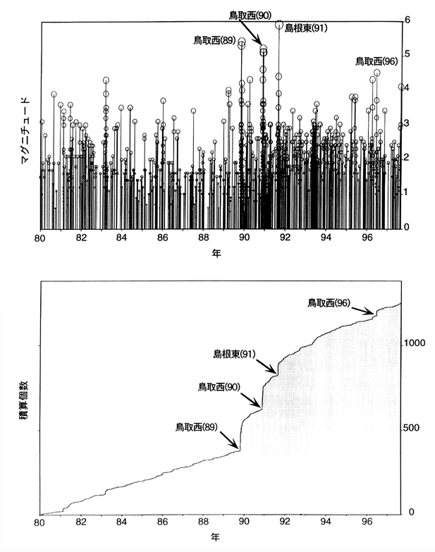 図3(下図):図1全範囲の地震に関する積算個数の時間変化