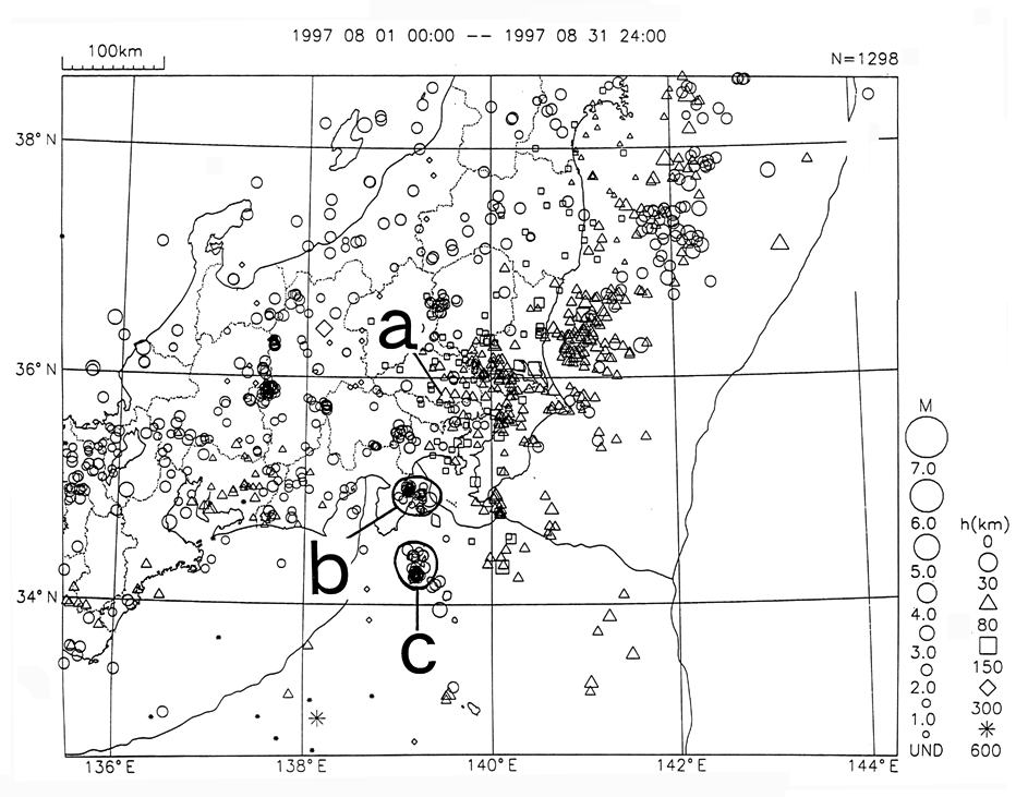 b)伊豆半島東方沖で6月末から微小地震の活勅が続いている(最大は8/27のM3.7)。