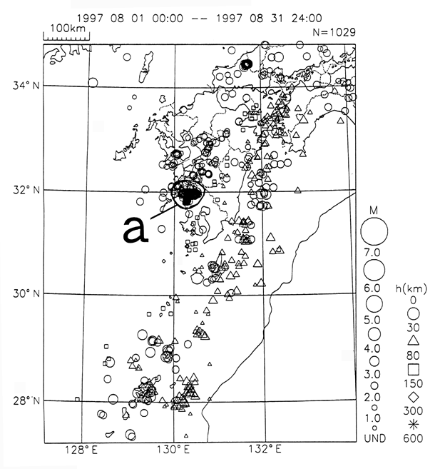a)鹿児島県北西部の地震(3/26 M6.3、5/13 M6.2)の余震域の活動は8月中旬から下旬にかけてやや活発になったものの減衰している。