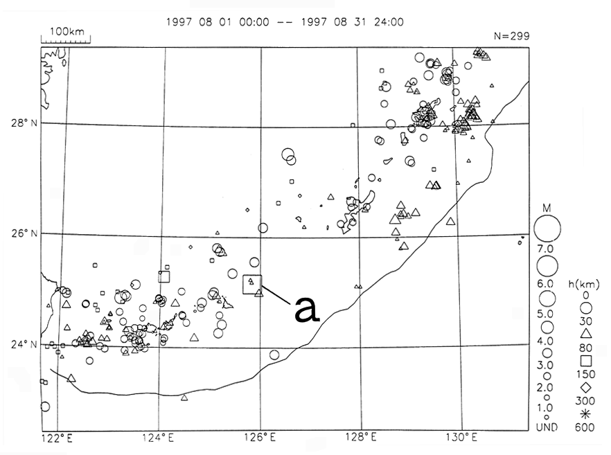 a)宮古島近海で8/13にM6.1の地震が発生した。