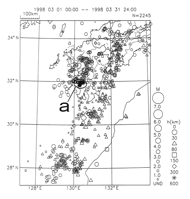 a)鹿児島県北西部の1997/5/13 M6.3の地震の余震域南側延長部で3/3にM3.8の地震が発生した[最大震度4]。また1997/3/26M6.5の地震の東西に分布する余震域内の東側で3/27にM4.1の地震が発生した[最大震度3]。この地震の後、5分程度の間に、ほぼ同じ場所でM3.5、M3.9、M3.3の地震が続けて発生した。