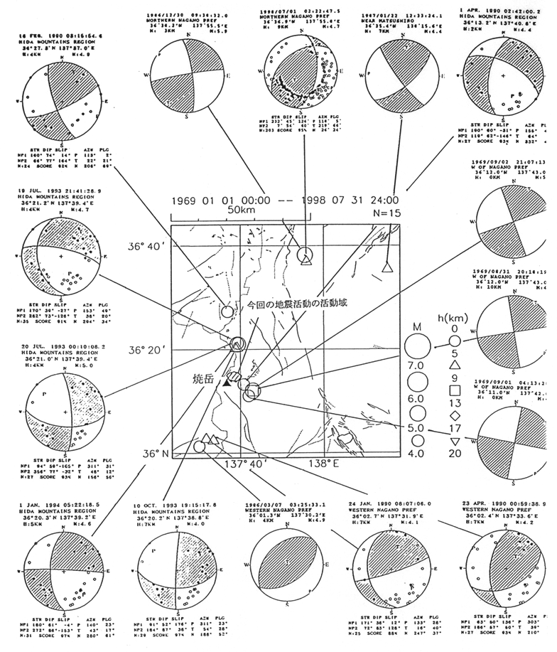 長野県中部(上高地付近)の地震のメカニズム(1969年〜1998年7月)