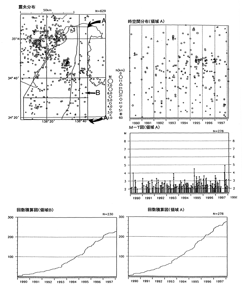 駿河湾の地震活動(1990年1月1日〜1998年2月8日 M≧2、 0≦depth≦60km)