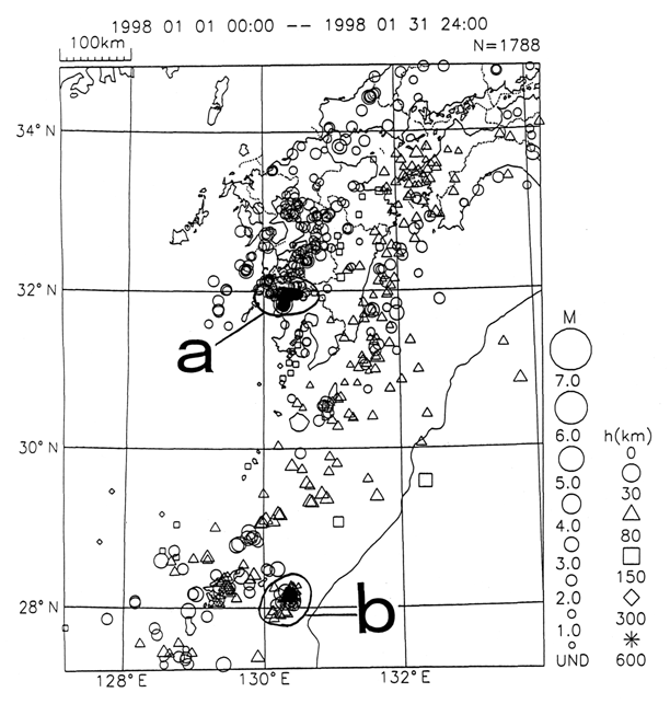 a)鹿児島県北西部の一連の地震(3/26 M6.5、5/13 M6.3)の余震活動は減衰している。余震域の南側延長部で、12月中旬以降活動がやや活発化しており、1/10にはM4.1の地震[最大震度4]が発生した。