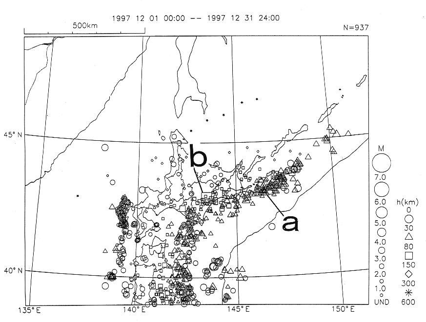 a)根室半島南東沖で、12/22にM5.0の地震が発生した。北海道東方沖地震(1994/10、M8.1)の余震域の南西部に位置している。